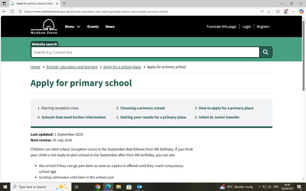 In Waltham Forest children usually start full-time education in a Primary School in the Autumn term of the school year in which they become five years old.